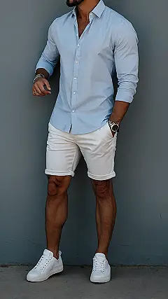 Smart casual for guys? Think of it as dressing up just enough so your grandma says you look “nice” but not so much that your friends think you’re going to a wedding. Look at this guy in the picture! He’s rocking a light blue shirt and crisp white shorts – it’s like he just rolled out of bed looking effortlessly cool, but you know he put *some* thought into it. It’s the perfect vibe for when track pants are a major fashion crime but a full suit would make everyone stare.