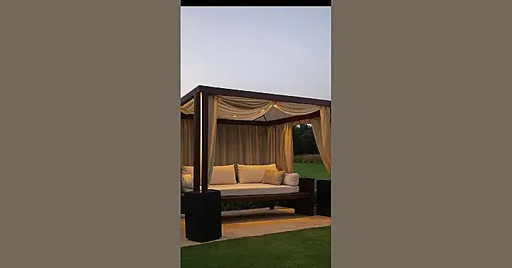 Whoever designed this canopy definitely knows how to live the good life. The lighting makes it look super cozy, and those curtains probably block out just enough sunlight for the perfect afternoon nap. Forget your bedroom, this outdoor oasis is where you’d find me doing homework (or, let’s be real, probably just scrolling through TikTok).