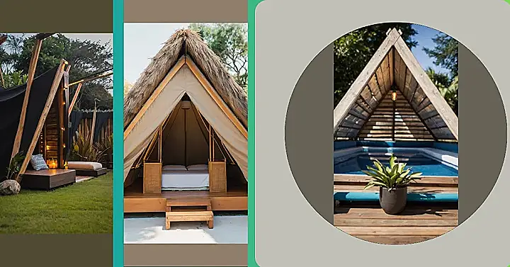 Imagine this: you’re lounging by your own super-chill cabana, a tiny wooden A-frame paradise that’s way cooler than a regular beach umbrella. It’s got a little pool inside—perfect for a quick dip to cool off on a hot day—and a hanging light that makes everything feel super cozy. No need for fancy stuff; this cabana is all about simple comfort and maximum chill vibes. Add some plants for that extra touch of nature, and you’ve got yourself a perfect hideaway!