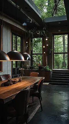 This dining room is seriously giving “treehouse vibes.” Imagine eating breakfast while the sunlight streams in through the giant windows. It’s like you’re having a meal surrounded by a giant, green, leafy hug! The cool thing is, it’s not just windows – there’s a giant skylight right above the table! It’s like a little slice of the forest came inside, which is perfect for anyone who wants to feel connected to nature, even while they’re inside.