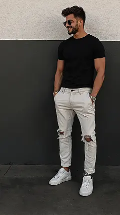 Forget perfect, these jeans are all about looking cool without trying too hard. See the guy in the pic? His jeans have just the right amount of rips, like they’ve been on some adventures (even if the biggest adventure was just finding a good spot for a selfie). It’s like they say, “Yeah, I know I look good, and I’m not even bothered by a few holes.” That’s the secret sauce of men’s streetwear jeans – looking awesome while being totally relaxed.