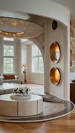 This living room is like something out of a magazine! Look at that cool circular couch – it’s like a giant donut! And the coffee table looks like it could be a spaceship from the future! They’re all surrounded by an even bigger, round rug that kinda looks like it’s floating on the floor. It’s a really interesting design choice, and makes the whole room feel cozy and inviting, like a giant hug.