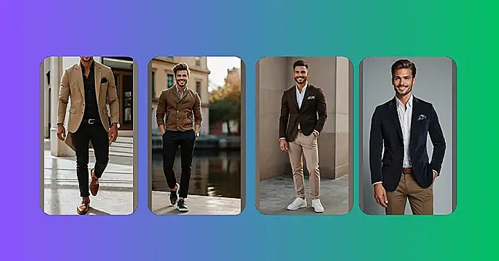 This guy’s got it going on! Check out that chocolate-brown blazer – it’s like the perfect blend of serious and stylish. Paired with those super chill khaki pants and crisp white sneakers, he’s totally rocking the “dressed-up but not too dressed-up” look. It’s the kind of outfit that’s perfect for a school dance (if you’re feeling fancy!), meeting your grandparents, or just impressing your friends. It proves that men’s fashion blazers aren’t just for stuffy old meetings!
