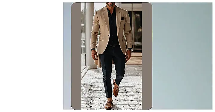 This guy is rocking a tan suit! It’s like a stylish update on the classic, boring “grey suit.” He’s got a white shirt tucked in, which really makes the suit pop. The white shoes are a bold choice that adds a touch of modern cool, and that snazzy belt adds a touch of luxury. He looks ready to take on the world, whether it’s a big meeting, a fancy dinner, or just a day at the mall!