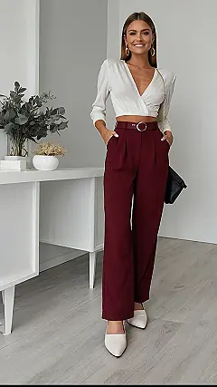Seriously, though, who knew wine-coloured pants could be this cool? This whole look proves that you can mix and match to create a stunning outfit that’s both professional and effortlessly chic. The white shirt keeps things light and airy, while those rich burgundy pants add a touch of grown-up glamour. It’s like a secret weapon for any occasion – school dances, interviews, even just hanging out with friends. You’ll feel like a million bucks, and that feeling is priceless!