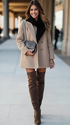 This picture shows a woman rocking a camel coat – seriously, it’s like she’s stepped out of a fashion magazine! The coat is super stylish and the color is perfect for fall or winter. Paired with those amazing over-the-knee boots, she’s totally nailed the “women camel coat outfit” look. It’s the kind of outfit that makes you want to grab a latte and stroll through a Parisian street (even if you’re just walking to school!).