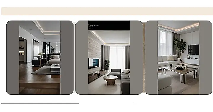 That super cool TV is set against this awesome wooden wall, like a modern masterpiece. The whole place is so stylish and calming; it’s the kind of room where you could totally ace that next big history test. No distractions, just you, your books, and this super-chill, seriously stylish space! Plus, imagine having friends over – this living room is like a magnet for good times and effortless cool! It’s practically a mood board come to life, showcasing a clean and modern interior design that’s both effortlessly cool and seriously comfy.