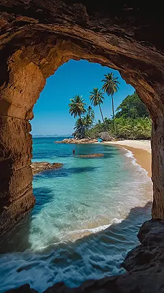 Wow! Imagine finding this hidden gem, a totally awesome beach viewed through a secret cave! It’s like nature’s own picture frame showing off a seriously pretty landscape. Those palm trees look like they’re waving hello, and the turquoise water is so clear you’d probably want to jump right in! This is the perfect postcard picture for your Instagram, so grab your phone and start snapping before someone else does! This is definitely one for the “pretty landscapes photography” album.