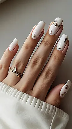 These “soft winter nails” are totally goals! The tiny gold accents are like sparkling winter magic, adding a touch of elegance without being too over-the-top. They’re the kind of nails that say, “I’m stylish, but I’m also ready for a hot cocoa and a good book.” Plus, the soft white color is super versatile – it’ll match everything in your wardrobe, from your favorite jeans to your festive holiday sweater. They’re basically the ultimate winter accessory!
