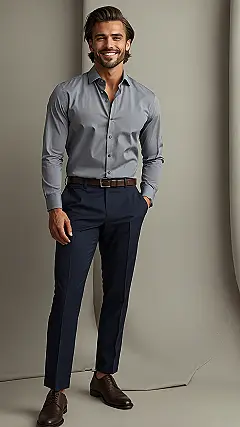 Check out this guy’s setup: a cool grey shirt, sharp navy pants, a smooth belt, and snazzy shoes. It’s like each piece works together to whisper, “Yep, I’m here to handle business.” You put on an outfit like this, and suddenly you feel like you could ace that presentation or negotiate a really good deal on pizza toppings. It’s funny how just changing your clothes can make you feel all professional and important!