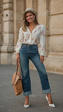 So, you want to look like you just stepped out of a French movie, huh? Well, peep this outfit! That floral blouse is super cute and not too over-the-top. Paired with those jeans, it’s like saying, “Yeah, I’m stylish, but I can also totally chill in a café and people-watch for hours”. It’s that perfect mix of polished and laid-back that the French seem to nail every single time.