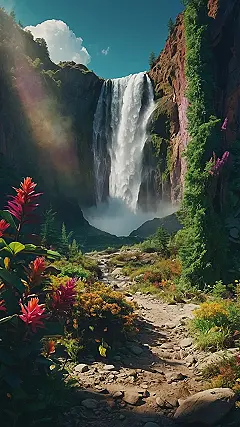 Okay, so imagine you’re playing hide-and-seek, but the prize is a breathtaking waterfall. This wallpaper is like that! You’re totally “lost in nature” territory, where the trees are all lush, the flowers are showing off their best colours, and there’s even a mysterious path leading towards a giant curtain of water. If you were to take this wallpaper and hide it in your room, your computer background would look a million times better.