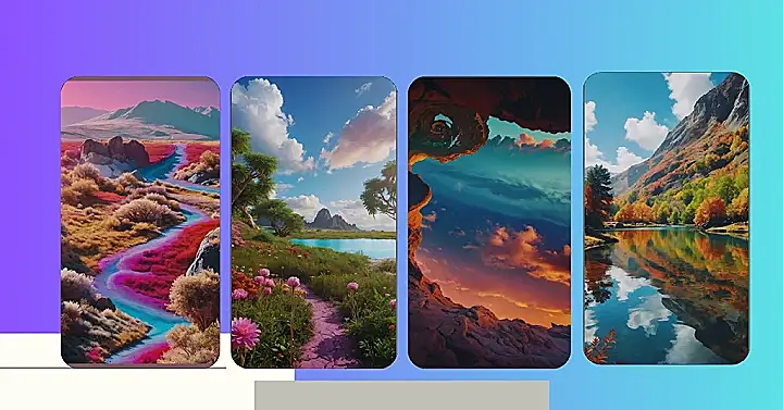 This picture makes you feel like you’re in a dream, right? Imagine walking along that winding river, the bright blue water sparkling in the sunlight. The grass is a crazy mix of colours, like someone spilled a giant paint bucket over the whole scene. But the best part is that you can almost hear the wind whistling through the trees, making that river look like a giant, shimmering ribbon stretching out forever.
