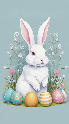 This bunny’s got the whole aesthetic down! Just look at those perfectly pastel eggs, practically begging to be hidden (or eaten, let’s be real). With those ears up like satellite dishes, it’s probably listening for the best places to score some carrots or maybe even eavesdropping on your Easter playlist. Definitely wallpaper material if you want your phone to scream “Spring has sprung!”