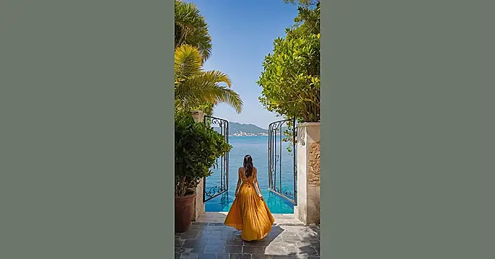 Walking into a place like this is basically like stepping right into your phone wallpaper. You know, those super aesthetic places you scroll through online and think, “Yeah, my backyard looks *exactly* like this… if my backyard had a private pool overlooking the ocean and palm trees that didn’t look like they were judging my life choices.” This woman in the bright yellow dress is just living her best life, probably on her way to dramatically pose by the water, because when you find a spot this gorgeous, you gotta make sure your photo game is on point. Just try not to trip on your fabulous long dress, okay? That would totally ruin the aesthetic.