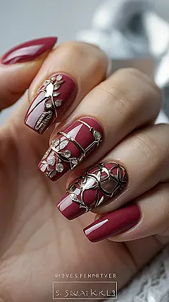 These aren’t just any nails; they’re like tiny pieces of art, perfect for showing off while you’re holding hands or scrolling through your phone (we all do it). The dark plum and soft pink combo with those gold details is super classy and adds a touch of “I’ve got this” to any outfit. Plus, if the date’s a dud, at least you’ve got some amazing nails to admire!