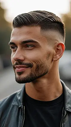 Okay, so check out this haircut – it’s called a fade, and it’s basically like the chameleon of hairstyles. You can dress it up with a leather jacket and a tie like this guy, or rock it with your favorite hoodie. The cool part is how the hair gradually gets shorter down the sides and back, almost like it’s fading away, hence the name! If you’re thinking about switching up your look, this is a solid choice that’s guaranteed to look good, whether you’re trying to impress someone or just impress yourself in the mirror.