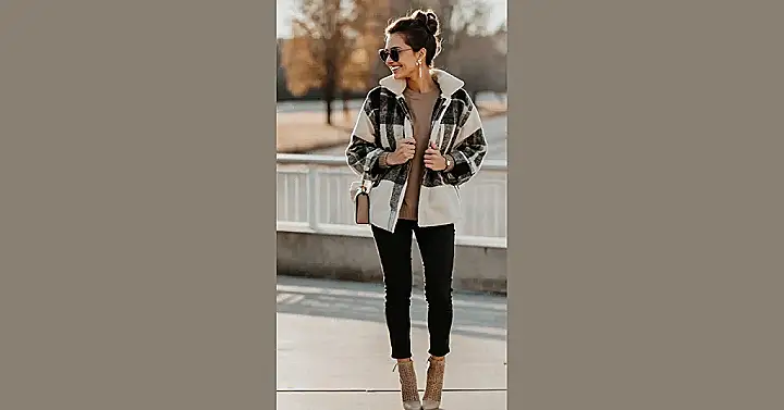 This outfit is seriously giving us all the fall feels! The plaid jacket is like a cozy hug for your shoulders, and the cute booties are just begging to be worn on a crisp autumn day. Don’t forget the statement earrings! They’re the perfect touch of sparkle to make this look extra special. You could even add a cute scarf or beanie to really embrace the autumn vibe. Let’s be honest, though, even without those extra accessories, this outfit is already a total winner. You’re gonna rock the fall season in this look!