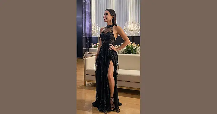 That dress is seriously stunning! It’s like something a super-spy would wear to a masquerade ball – all sleek and black, with just the right amount of sparkle. Imagine gliding into a party in this thing, everyone would be whispering, “Who’s that mysterious beauty?” You’d be the talk of the town, maybe even accidentally start a slow-motion chase scene through the lobby – it’s THAT chic. Seriously though, that side slit is totally on point, perfect for showing off your killer dance moves (or for a quick escape if needed).