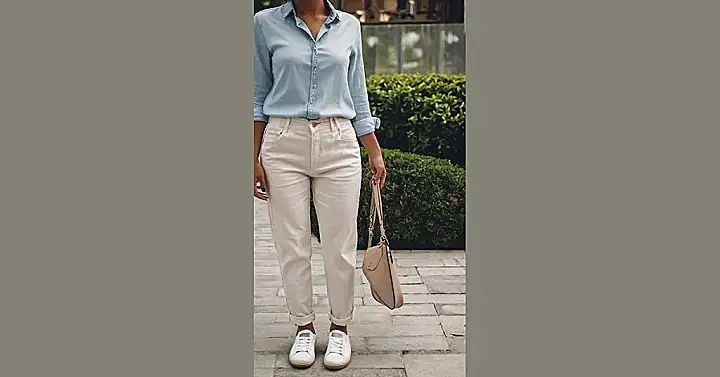 Don’t be fooled by the long sleeves – that light, airy fabric is totally breathable, so you won’t overheat while slaying all day. Plus, you can always roll them up if you’re feeling extra sassy. This look is proof that summer casual doesn’t have to mean just shorts and a tee. You can rock pants and still beat the heat, looking like you just stepped out of a magazine!