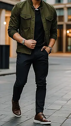This outfit is like James Bond going undercover but still wanting to look sharp. You’ve got the olive jacket that says, “I’m relaxed and outdoorsy,” but then bam! The sleek black pants and fancy brown shoes scream, “I know the password to the VIP lounge.” It’s the perfect combo for blending in while still looking like you could star in your own action movie.