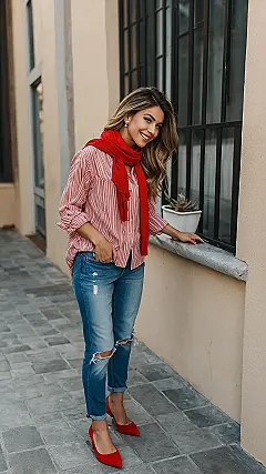And let’s talk about those pops of red! Adding a bright scarf and matching shoes is like putting a cherry on top of an already awesome sundae. It takes a simple shirt outfit and makes it unforgettable, turning heads without even trying too hard. It shows you thought just enough about your look to make it fun and stand out from the crowd, proving that sometimes, the coolest women’s shirt outfits are all about the little details and not being afraid to add a little happy color to your day.