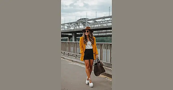Who says you need a long skirt to look stylish in the fall? This outfit shows that shorts can totally be a fall fashion staple! That mustard yellow jacket adds warmth and pops of color, and those white boots are totally chic. Plus, a good pair of sunglasses is always a must-have for a fall day, whether you’re strolling through a park or chilling with friends.