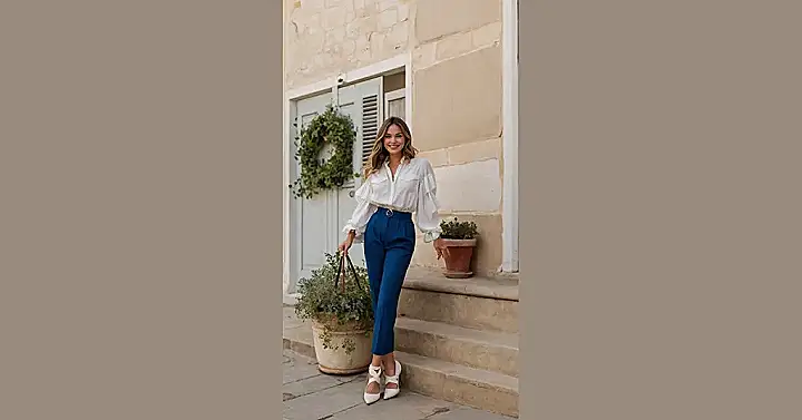 So, you wanna look like you just stepped out of a French movie? This outfit is totally giving off those vibes! The classy blouse paired with the cropped pants is simple, but the whole look is super put-together. Plus, the heels? Total power move. It’s like, “Yeah, I woke up like this… casually flawless and ready for croissants.”
