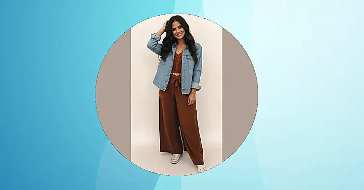 This outfit is like a hug from a fashion magazine. It’s super comfy but also effortlessly stylish! You’ve got the cool girl denim jacket, those comfy pants that make you feel like you’re floating on a cloud, and a touch of boho magic with the brown color. It’s like the perfect balance of trendy and cozy, and honestly, who wouldn’t want that?