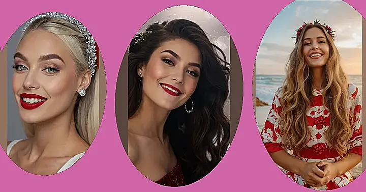 Seriously, those loose waves are dreamy! And that bold red lipstick? It’s like a Christmas candy cane came to life. It’s the ultimate holiday pop of color, perfect for adding a festive touch without being too over-the-top. Pair it with this hairstyle and you’re basically a walking Christmas card; stylish, fun, and ready to spread some holiday cheer. Who needs mistletoe when you’ve got this?