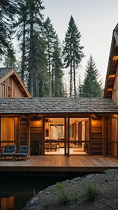 This picture shows a really cool house made mostly out of wood! It’s like a giant wooden puzzle, with different pieces fitting together perfectly. The wood makes it look warm and cozy, like the perfect place to relax after a long day. You can almost imagine sitting on the porch, sipping hot cocoa, and watching the sunset.