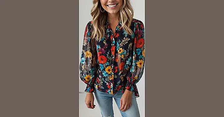 Wearing a floral blouse is basically telling the world you’re a walking, talking mood booster! It’s like having a tiny garden party happening on your upper half, minus the ants and awkward small talk. The one in this picture is like a burst of warm sunshine and good vibes, proving that a shirt can totally have personality. It’s the kind of top that makes you feel ready to conquer your day, or at least look really cute while grabbing ice cream.