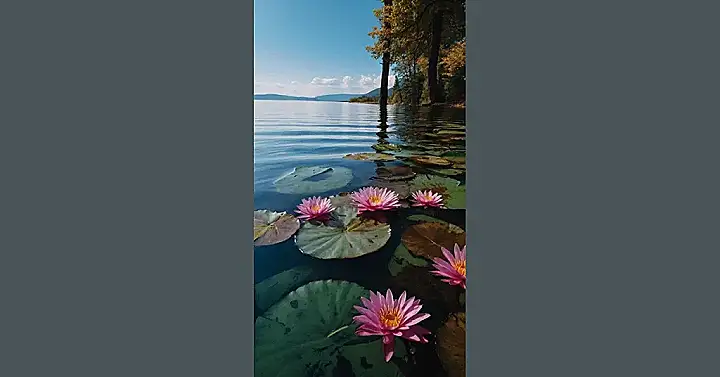 Wow, check out this picture! It’s like a postcard from a super peaceful place. You’ve got these gorgeous pink water lilies just chilling on their lily pads, looking like they’re posing for a magazine cover. The water is so still and reflective, it’s almost like a mirror showing off the pretty landscape and the sky beyond. It’s the kind of view that makes you want to grab your camera and start taking “pretty landscapes photography” pictures of your own!