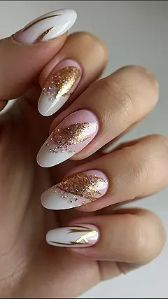 These nails are totally rocking the French manicure game, but with a seriously sparkly upgrade! Forget boring old white tips—these nails are decked out with delicate pink, shimmering gold accents, and even a little bit of glitter. It’s like a French manicure went to a fancy party and came back with some seriously awesome accessories. They’re pretty enough for a princess, but still totally fun and cool for anyone who loves a little bit of bling.