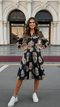 This look screams, “I’m ready for warmer weather, but also ready to run if someone spills their iced latte!” I mean, that dress is floral perfection, but the sneakers keep it real. It’s like saying, “I can rock a fancy garden party, but I’m also down for pizza and Netflix.” Plus, wearing sneakers with a dress is basically a fashion cheat code for comfort. Who wants blisters when you can be cute *and* comfy?