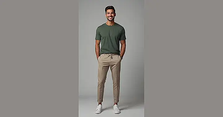 This guy’s got the “I woke up looking like this” look down pat! He’s rocking a simple green t-shirt, comfy khaki pants, and classic white sneakers. It’s the kind of outfit you can wear for a day of errands, a casual hangout with friends, or even just lounging around the house. It’s like he’s saying, “I’m cool, I’m comfortable, and I’m ready to take on the day!”