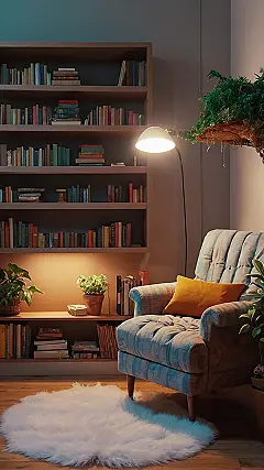 And look at that bookshelf! It’s practically overflowing with stories just waiting to be discovered. I wonder what kind of adventures are hiding within those pages? Maybe a wizard, a superhero, or even just a really dramatic love triangle. Whatever it is, I bet chilling out in this cozy corner would make even the most boring plot twist seem exciting!