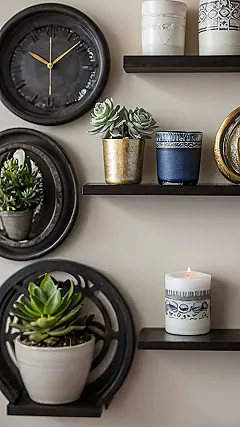 This isn’t your grandma’s wall decor! Forget dusty knick-knacks; this setup is all about cool clocks, cute succulents, and stylish containers. It’s like a tiny, trendy botanical garden, but instead of watering cans, we’ve got stylish ceramic pots and a super chill clock that’s probably always running a little late (we all have those days, right?). It’s the perfect mix of modern and natural, and it’s just begging to be copied for your own room makeover!