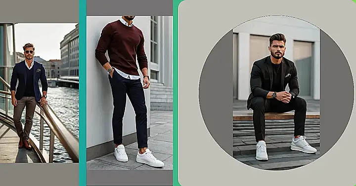 This guy’s got corporate casual down to a T! Check out that maroon sweater – perfect for keeping things sophisticated but not stuffy. It’s like he’s saying, “I’m ready for that big presentation, but also totally down for a post-work coffee.” The navy pants and crisp white sneakers add just the right touch of effortless cool; he’s basically a walking, talking definition of “business casual meets weekend chill.” Who knew looking this sharp could be so comfortable?