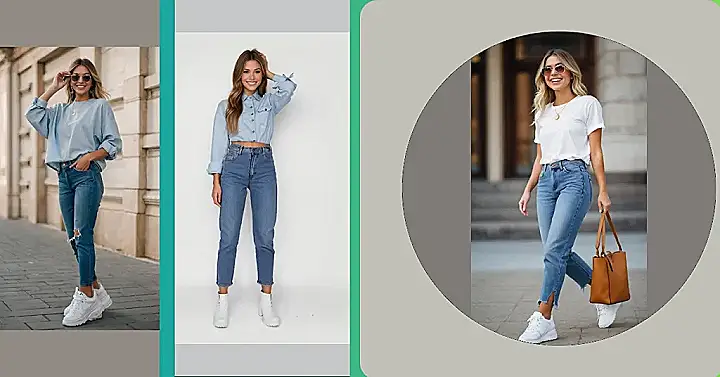 This outfit is seriously chill! Those mom jeans are totally rocking it – they’re like the comfy, cool older sibling of skinny jeans. Paired with a simple white tee and some crisp white sneakers, it’s the perfect look for hanging out with friends, grabbing coffee, or even just chilling at home. No fuss, no muss, just pure casual coolness.