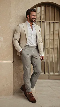 This guy’s outfit is seriously sharp! He’s rocking a beige blazer and gray trousers – like a super-smooth, sophisticated secret agent, but instead of chasing bad guys, he’s probably off to a fancy art gallery opening or a high-end coffee shop. It’s the kind of outfit that makes you want to ask, “Where’d you get that?” The whole look screams “men’s high-end fashion,” and honestly, who wouldn’t want to look this good? It’s the perfect blend of cool and classy, making even a simple stroll look like a runway show.