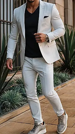 Forget the stuffy old tuxedos; this outfit is all about effortless style. It’s like wearing pajamas but looking a million bucks – who wouldn’t want that? The crisp white jacket and pants give off major “I’m successful, yet relaxed” vibes, and that black t-shirt underneath keeps things casual and comfortable. This whole look screams sophisticated casual, which is basically the ultimate fashion goal. The best part? You can wear it to anything, from a fancy dinner to a casual hangout – it’s so versatile, it will become your go-to choice.