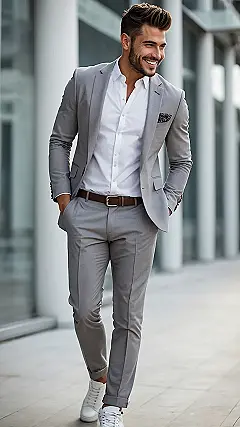 Check out this guy in the picture – he’s rocking a cool grey blazer and pants, but check out those crisp white sneakers! Who says you need dress shoes to look this good? Mixing a sharp blazer with comfy kicks is like getting the best of both worlds: you look polished enough for pretty much anything, but you can still totally bail if things get awkward. It’s the perfect outfit for when you want to look like you *tried*, but didn’t, you know? Maximum style, minimum fuss.
