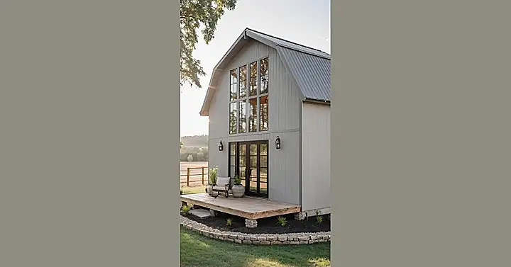 Being a small barndominium is actually its superpower. Who needs a mansion where you get lost trying to find the fridge? This place looks cozy enough for epic movie nights without needing a walkie-talkie system. The picture shows off that sweet wooden porch detail and nice big doors, making it feel welcoming, not like some creepy old barn. Plus, those big potted plants make it look like it’s got its life together, even if you don’t. It’s basically the cool, compact version of living that makes you feel like you’ve got a unique pad without the massive footprint of a giant house.