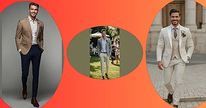Getting invited to a summer wedding feels a bit like being challenged to a sweat competition where the dress code is “fancy.” Look at this dude in the picture, rocking that light tan suit like it’s no big deal! Picking out a summer wedding outfit for guys is all about finding that sweet spot between looking totally put-together and not melting into a puddle before the cake is even served. Think light colors like this one; they reflect the heat instead of absorbing it like some kind of heat-seeking missile suit, helping you survive the outdoor ceremony without needing a personal fan crew.