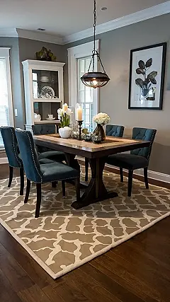 Check out this dining room – it’s like they took “fancy” and turned it up to eleven! With those comfy-looking blue chairs and that rug that totally pulls the room together, it’s clear someone put some serious thought into the dining room decor. It’s so stylish, you might actually want to do your homework at the table instead of binge-watching TV… maybe.