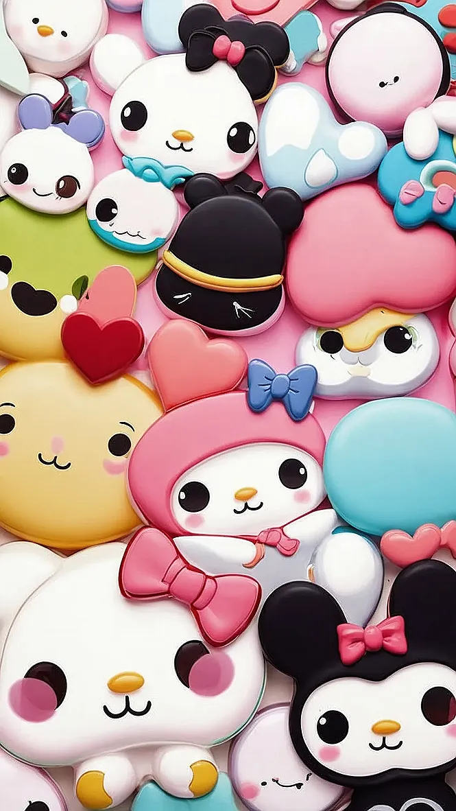 This wallpaper is like a giant hug from all your favorite cartoon characters! There are fluffy bunnies, cute little animals with big eyes, and even a few mystery characters hiding in the mix. They’re all crammed together in a super sweet way, like a giant pile of adorable plushies. It’s the perfect way to add some fun and whimsy to your phone or computer screen.
