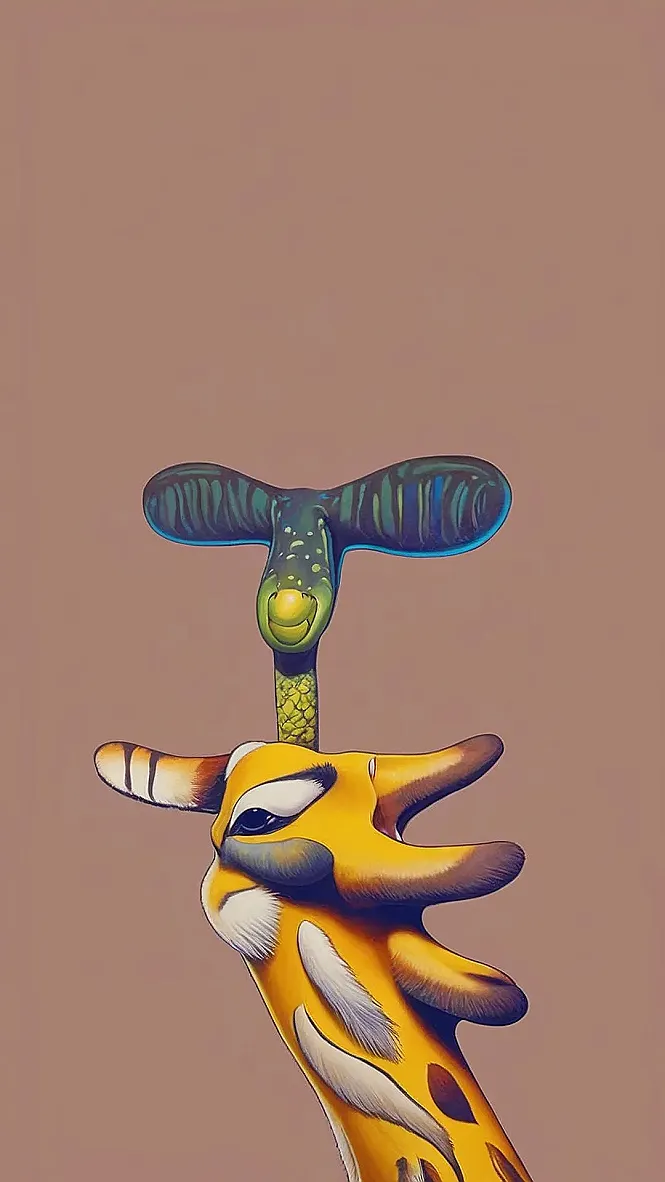 This cartoon wallpaper is totally wild! It features a super-cool giraffe with a funky, almost alien-looking creature on its head. The giraffe looks like it’s about to strike a pose, maybe for a dance-off or a fashion show. The creature on top has this funny, friendly face that makes you think it’s up to no good. It’s like a cartoon version of a wild safari adventure but in a super stylish way.