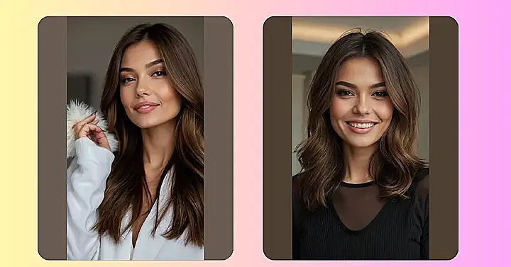 This hairstyle is seriously amazing! It’s like the model’s hair is a perfectly framed masterpiece, showcasing those gorgeous face-framing layers. It’s long, luscious, and has these amazing waves that make it look like she just stepped out of a shampoo commercial (but probably with a little more effort – let’s be real!). The color is stunning too – a rich brown with hints of something lighter, adding so much dimension. I’m pretty sure if I tried this, I’d look like a majestic, slightly messy, brown-haired unicorn.