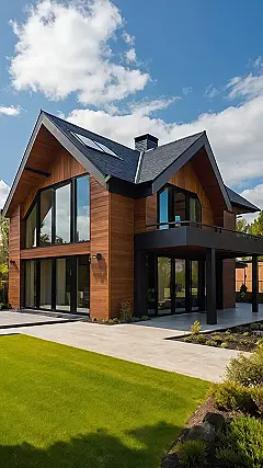 This house is like the superhero version of a regular suburban home! It’s got that chill, “I’m in a nice neighborhood” vibe with the lawn and all, but then BAM! Check out those huge windows and modern wood panels. It’s like it’s saying, “Yeah, I’m cozy, but I’m also ready to fight crime… or at least host the coolest movie night ever.”